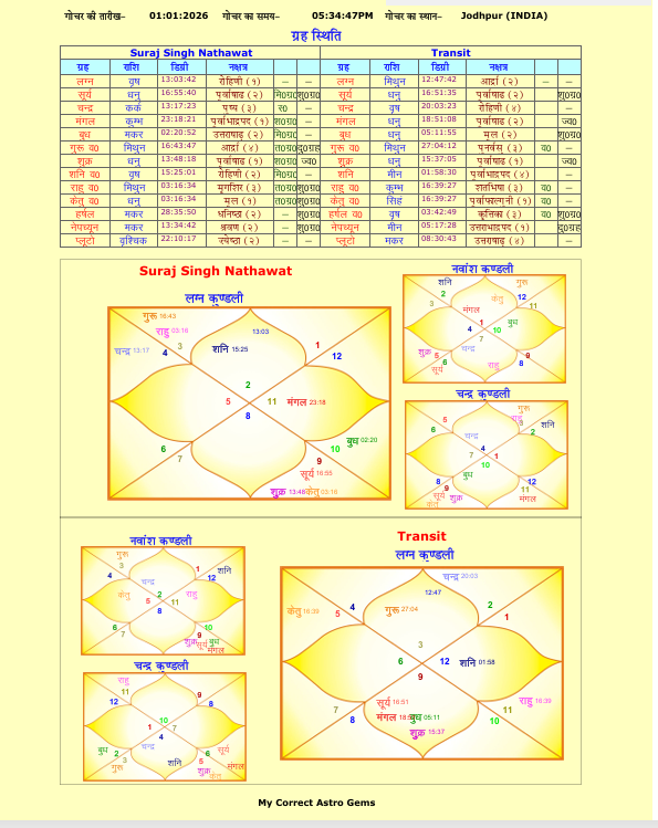 √ Detailed Analysis of Your Janm Kundli – ज्योतिष चार्ट एवं ग्रहों की स्थिति, सामान्य भविष्यवाणी, करियर, भाग्योदय वर्ष, व्यवसाय एवं नौकरी, कमजोर अवधि, मित्रता, प्रेम, वैवाहिक जीवन, मिथुन लग्न चार्ट, नवतारा चक्र, ग्रहों की बल अवस्था, दशा–अंतरदशा विश्लेषण, वर्तमान वर्ष का वर्ष कुंडली एवं वर्ष फल, अकारक, योगकारक, बाधक एवं मारक ग्रह